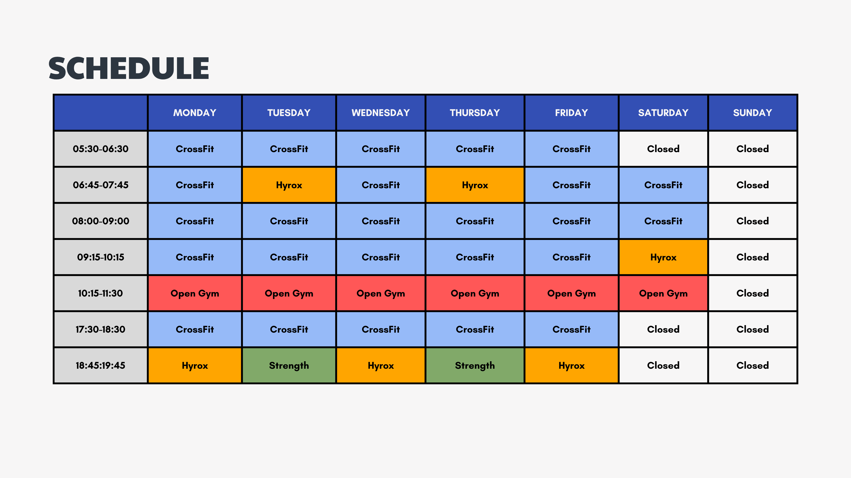 The Hyrox classes are designed to improve your aerobic endurance and help you become a healthier, more well-rounded individual. With a focus on longer time domains and simple, non-complex exercises, these 30-40 minute workouts are accessible to all fitness levels. Classes are held Monday, Wednesday, and Friday at 6:40pm, Tuesday and Thursday at 6:45am and Saturday at 9:15am.